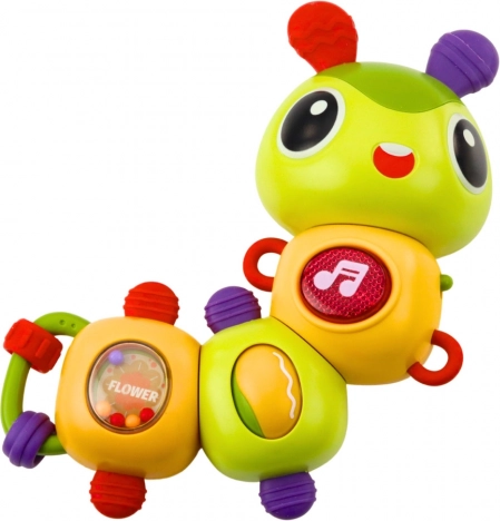 Interaktívna senzorická húsenica – hudobná hrkálka a hryzátko s otočnými prvkami 360°