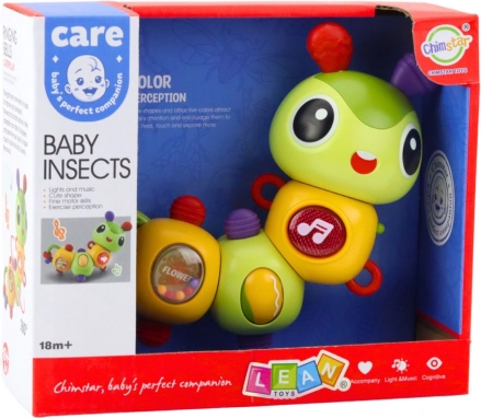 Interaktívna senzorická húsenica pre deti od 18 mesiacov: LED svetlá, melódie, otočné prvky 360°, koráliky, hrkálka a hryzátko. Podpora zmyslov a motoriky.