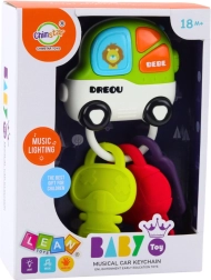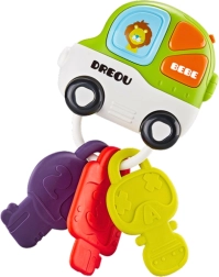 Interaktívne kľúče pre najmenších kombinujú svetelné efekty, veselé zvuky, funkciu hrkálky a mäkké hryzadlo. Farebný ovládač v tvare autíčka s tromi veľkými tlačidlami podporuje jemnú motoriku, senzorický rozvoj a zabaví deti doma aj na cestách.