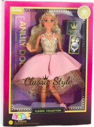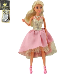 Elegantná bábika v plesových šatách poteší každú malú milovníčku módy. Má výšku cca 30 cm, nosí rozšírené šaty v pastelových farbách so zlatou čipkou a štýlové doplnky – náhrdelník, náušnice a elegantné topánočky. Skvele sa hodí na hru na role, rozvíja fantáziu, kreativitu a sociálne zručnosti.