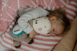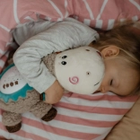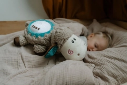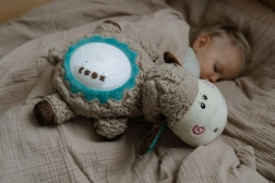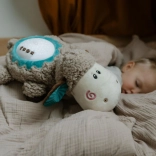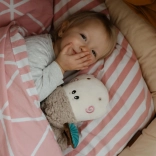 Ovečka svieti príjemným teplým svetlom a prehráva melódie aj tlmené zvuky prírody pre pokojné zaspávanie bez stresu.