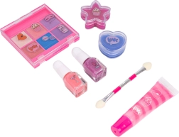- Kompletná výbava: matné očné tiene, trblietky, rúž, lak na nechty, štetce a doplnok.
