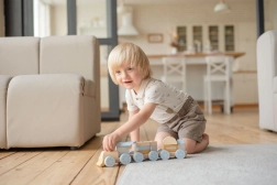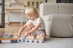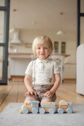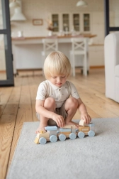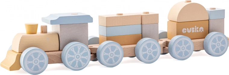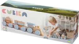 Pastelový dúhový vláčik CUBIKA je kvalitná drevená skladačka, ktorá spája hru a učenie. Deti skladajú farebné kocky na kolíky lokomotívy a dvoch vagónov a trénujú koordináciu rúk, farby aj tvary. Po zostavení meria vláčik približne 38 cm a je pripravený vyraziť na fantazijnú cestu.