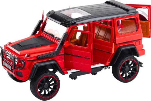 Kovový terénny voz 1:22 s pull-back pohonom, svetlami a zvukmi. Otváracie dvere, kapota a pohyblivý nárazník. Červený model, batérie v balení.