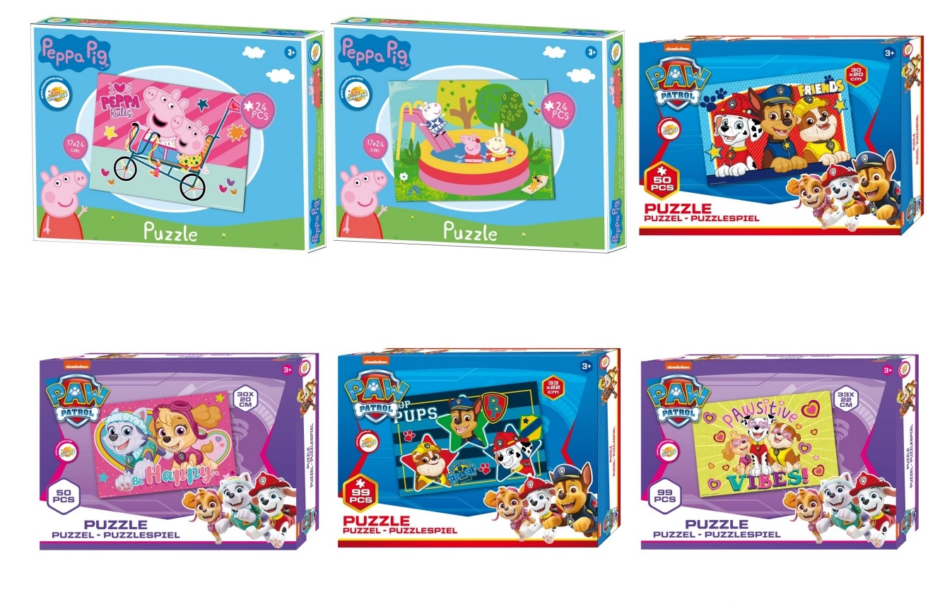 Zábavná sada detských puzzle vo variantoch 24, 50 a 99 dielikov prináša farebné motívy PAW Patrol alebo Peppa Pig. Rozmer krabice 25 × 18,5 × 3 cm, motív dodávame podľa aktuálnej skladovej dostupnosti. Skvelá voľba na rozvoj jemnej motoriky, logického myslenia a trpezlivosti.