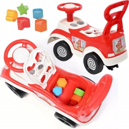 Jedna hračka – štyri funkcie. Dieťa trénuje chôdzu s oporou, odráža sa pri jazde a učí sa tvary vďaka vstavanému zoradovaču s farebnými kockami.