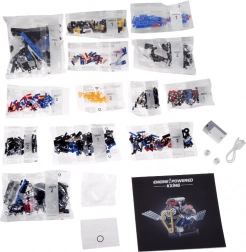 Súčasťou sú očíslované vrecúška pre jednoduchú orientáciu, USB kábel na nabíjanie a prehľadný obrázkový návod. Efektné červené svetlo dodáva modelu pôsobivý vzhľad a zvýrazňuje pohybujúce sa časti.