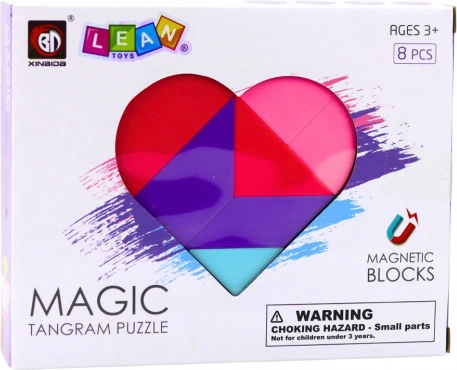 Objavte zábavu s magnetickým tangramom – srdce. Osem pestrých dielikov s kvalitnými magnetmi umožňuje skladať desiatky rôznych figúr a obrazcov. Vďaka pevnej fixácii sú modely stabilné, ľahko sa prenášajú a deti sa tak môžu dlho a radostne hrať.