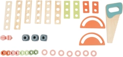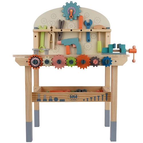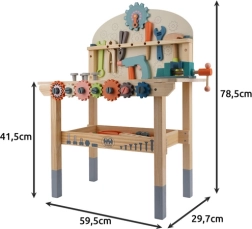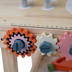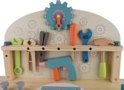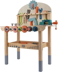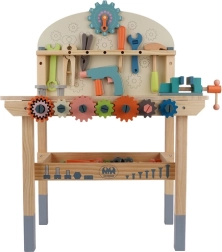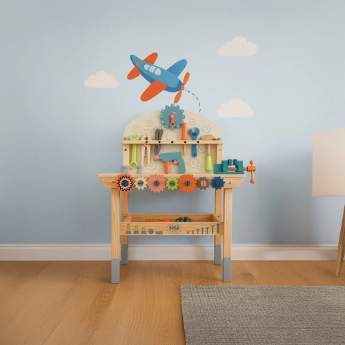 Súčasťou je bohatá sada náradia a spojovacieho materiálu, ktorá rozvíja jemnú motoriku, koordináciu oko–ruka aj logické myslenie. Praktická dolná polica ponúka priestor na uskladnenie súčiastok a doplnkov. Skvelý darček, ktorý poteší každého malého kutila.