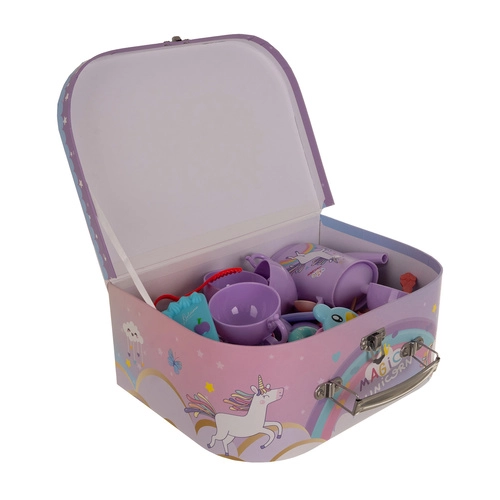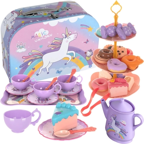 Roztomilá detská čajová sada v praktickom kufríku poteší každého malého hostiteľa. Obsahuje čajník, šálky, taniere, podnos aj trojposchodový stojan na sladkosti a 21 lahôdok. Vďaka kvalitným materiálom je odolná proti prasknutiu a poškrabaniu, podporuje kreatívnu hru a rozvoj sociálnych zručností a jej hladký povrch sa ľahko čistí.