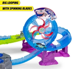 Užite si adrenalínovú jazdu na motorizovanej autodráhe s témou žraloka. Autá sa rútia plnou rýchlosťou cez slučku, prechádzajú vodným tunelom a môžu pristáť priamo pri obrovskom žralokovi – ten však môže kedykoľvek zovrieť čeľuste! Integrovaný turbo booster vyšvihne vozidlá na maximálnu rýchlosť a postará sa o intenzívny pretekársky zážitok.