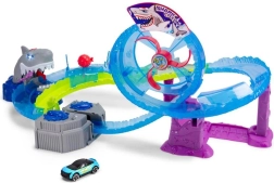 Zábavná autodráha s motívom WHITE SHARK prináša napínavú jazdu so slučkou, turbo boosterom a pôsobivými svetelnými a zvukovými efektmi. Kovové autíčko v balení, akčná jazda vodným tunelom a nečakané zovretie čeľustí veľkého bieleho žraloka.