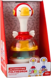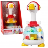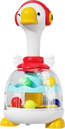 Táto zábavná a edukatívna hračka kombinuje jednoduché ovládanie s bohatými podnetmi pre zmysly. Stlačením hlavy husi sa spustí otočný mechanizmus, ktorý rozprúdi farebné guľôčky pod priehľadnou kupolou. O všetko sa postarajú pútavé svetelné a zvukové efekty, ktoré udržia pozornosť dieťaťa a podporia jeho prirodzenú zvedavosť.