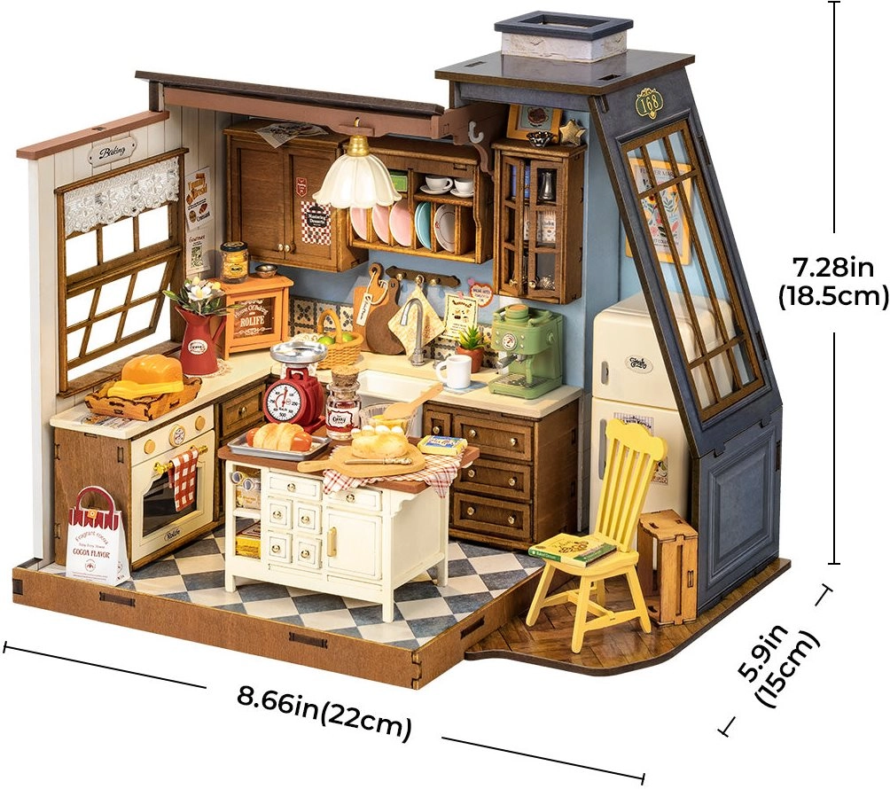 Tento detailne spracovaný miniatúrny domček prináša atmosféru starej dobrej kuchyne. Nájdete v ňom vstavané drevené skrinky, starodávnu váhu, kávovar, žiarivo biele pracovné dosky a retro žltú stoličku. Veľké okná – jedno s európskym šikmým presklením a druhé so strieškou a záclonou – dodávajú scéne svetlo aj čaro. LED osvetlenie navyše podčiarkuje hrejivý nádych domácej pohody.