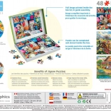 Praktická krabička s výklopným vekom slúži aj ako podklad – skladáte priamo v krabičke. Na vnútornej strane veka je prehľadný náhľad pre ľahšiu orientáciu. Výroba je šetrná k prírode: používa sa recyklovaný kartón a rastlinné atramenty. Puzzle je dodávané v zostavenom stave pre jednoduché zahájenie aktivity.