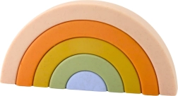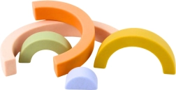 Táto pastelová dúhová sada z kvalitnej gumy nadchne každé dieťa aj rodičov. Jednotlivé oblúky v rôznych veľkostiach možno skladať, vrstviť aj prepájať do nápaditých tvarov. Mäkký materiál je príjemný na dotyk a šetrný k drobným rúčkam, takže je ideálny na prvé stavaníe.