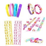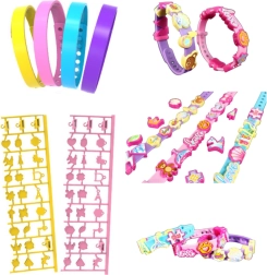 Vytvorte si vlastné originálne šperky s touto kreatívnou DIY sadou. Nájdete v nej 4 nastaviteľné gumové náramky v rôznych farbách, bohatý výber príveskov s písmenami a vzormi a farebné nálepky na jedinečné zdobenie. Skvelá zábava rozvíjajúca kreativitu, jemnú motoriku a zmysel pre estetiku.