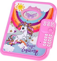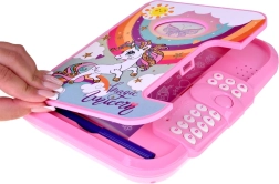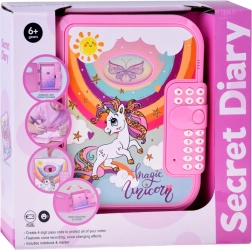 Interaktívny denníček s motívom jednorožca je vysnívaným miestom pre všetky detské myšlienky, kresby aj tajomstvá. Po zadaní správneho kódu sa denníček otvorí a odhalí ružový zošit, písaciu fixku a tajnú skrýšu na drobné poklady. Predný rámik si možno prispôsobiť výmenným obrázkom.