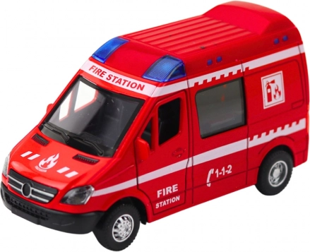 Kovový hasičský voz 1:32 s pull-back pohonom, svetlami a zvukmi. Otváracie dvere, kvalitné spracovanie, batérie v balení. Skvelý darček pre deti.
