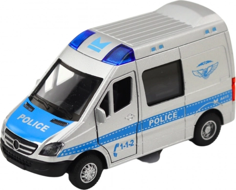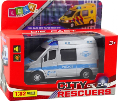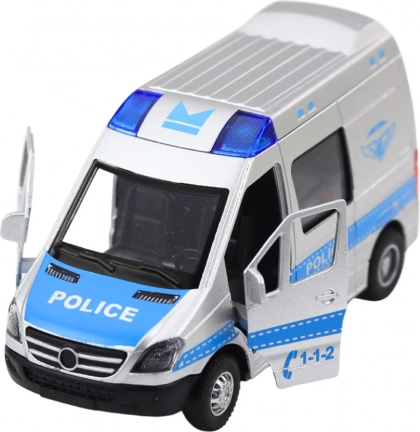 Kovový policajný voz 1:32 s pohonom pull back, otváracími dverami a svetelnými aj zvukovými efektmi. Odolné prevedenie, batérie AG13 v balení.