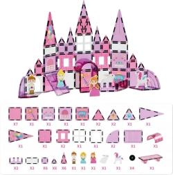 Táto ružová magnetická stavebnica je skvelou voľbou pre deti, ktoré milujú tvorenie a fantáziu. Polopriehľadné dieliky s motívmi princezien nádherne žiaria a ľahko sa spájajú vďaka integrovaným magnetom. Vytvárajte zámky, paláce, domčeky aj priestorové konštrukcie, ktoré potešia na pohľad aj pri hre.