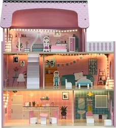 Veľký drevený domček pre bábiky KRUZZEL s LED osvetlením, 3 poschodiami a 5 izbami s balkónom poteší každé dieťa. Je bezpečný a pevný, vyrobený z hladko brúseného dreva bez ostrých hrán. V balení nájdete kompletnú sadu nábytku a doplnkov, takže zábava môže začať hneď po zostavení. Teplé biele svetlo vytvára čarovnú atmosféru aj pri večernom hraní.