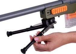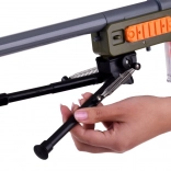 Horná časť zbrane aj predpažbie majú montážne lišty na jednoduché upevnenie príslušenstva, v balení nájdete optiku (lunetu) s možnosťou priblíženia/oddialenia a skladací bipod pre stabilnú oporu. Mechanický náťah zabezpečuje jednoduché ovládanie bez nutnosti batérií – stačí potiahnuť páku a prebiť zásobník.