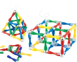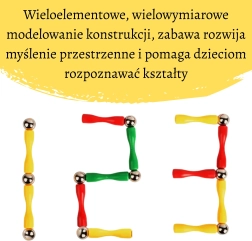 - 38 magnetických tyčiniek (modrá, žltá, oranžová), 40 kovových guličiek, 50 priehľadných stabilizátorov spojov