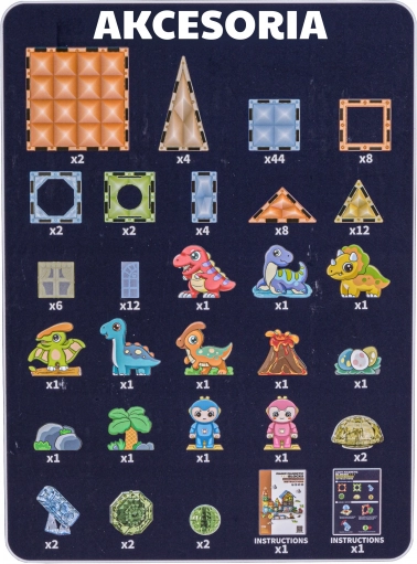 - Magnetické dieliky, figúrky dinosaurov a postáv, tematické prvky, ilustrovaný návod
