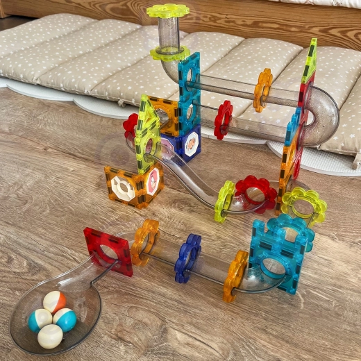 Stavebnica WOOPIE kombinuje magnetické dlaždice s priehľadnými prvkami guľôčkovej dráhy, aby deti mohli navrhovať a stavať nekonečné varianty tratí. Vďaka pevným spojom a kvalitným materiálom držia konštrukcie stabilne, zatiaľ čo guľôčky plynulo prechádzajú rampami, zákrutami, lievikmi a tunelmi. Učenie fyzikálnych princípov sa tak prirodzene prepája s hrou.