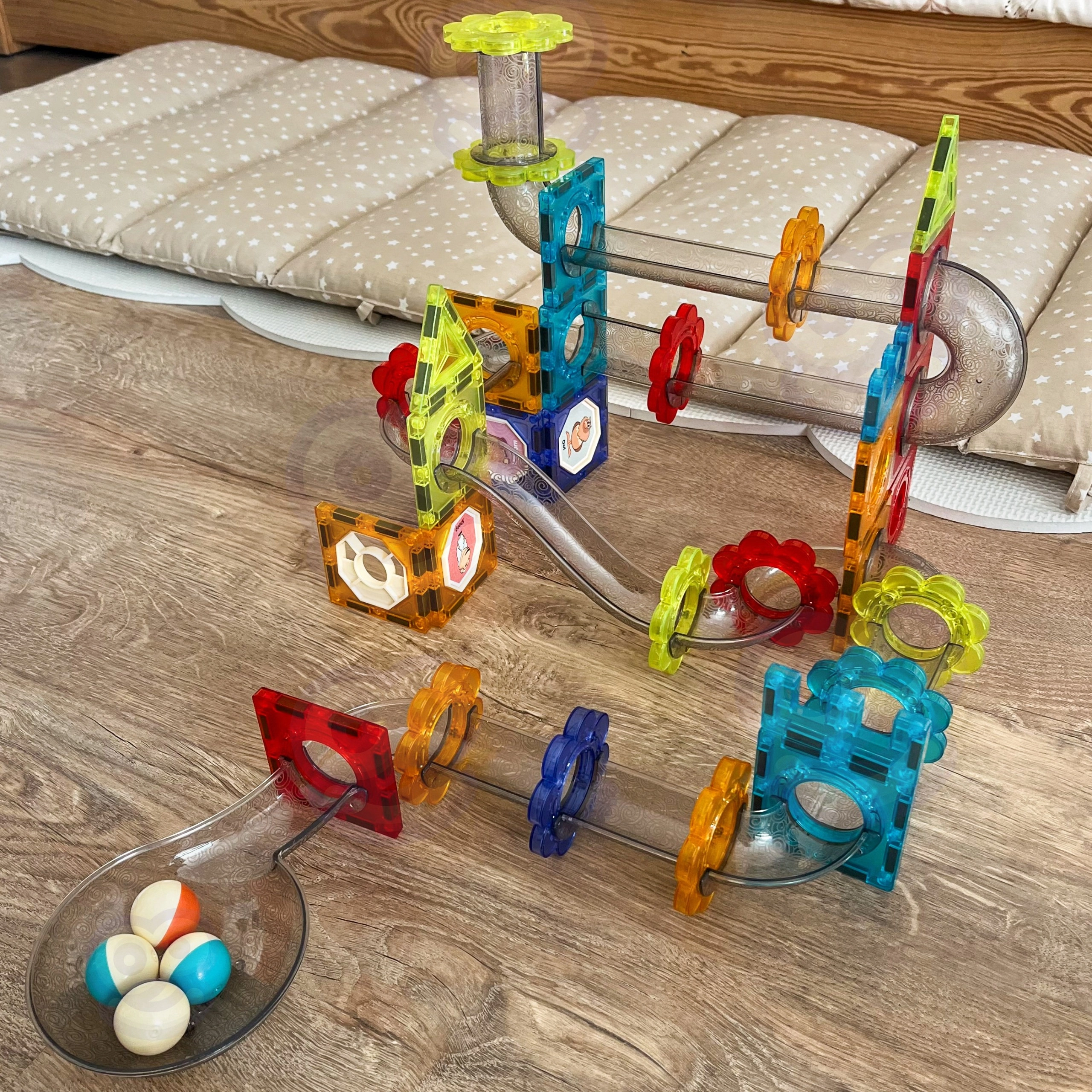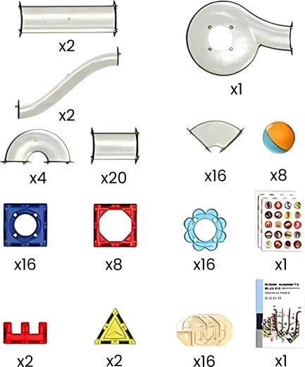 Magnetické dlaždice rôznych tvarov a farieb; priehľadné prvky dráhy (žľaby, zákruty, lieviky, tunely); farebné guľôčky; dekoratívne samolepky; ilustrovaný návod