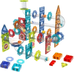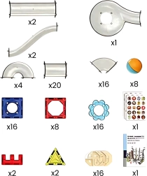 - Magnetické diely v rôznych tvaroch a farbách; priehľadné časti dráhy (žľaby, zákruty, lieviky, tunely); farebné guľôčky; dekoratívne samolepky; ilustrovaný návod