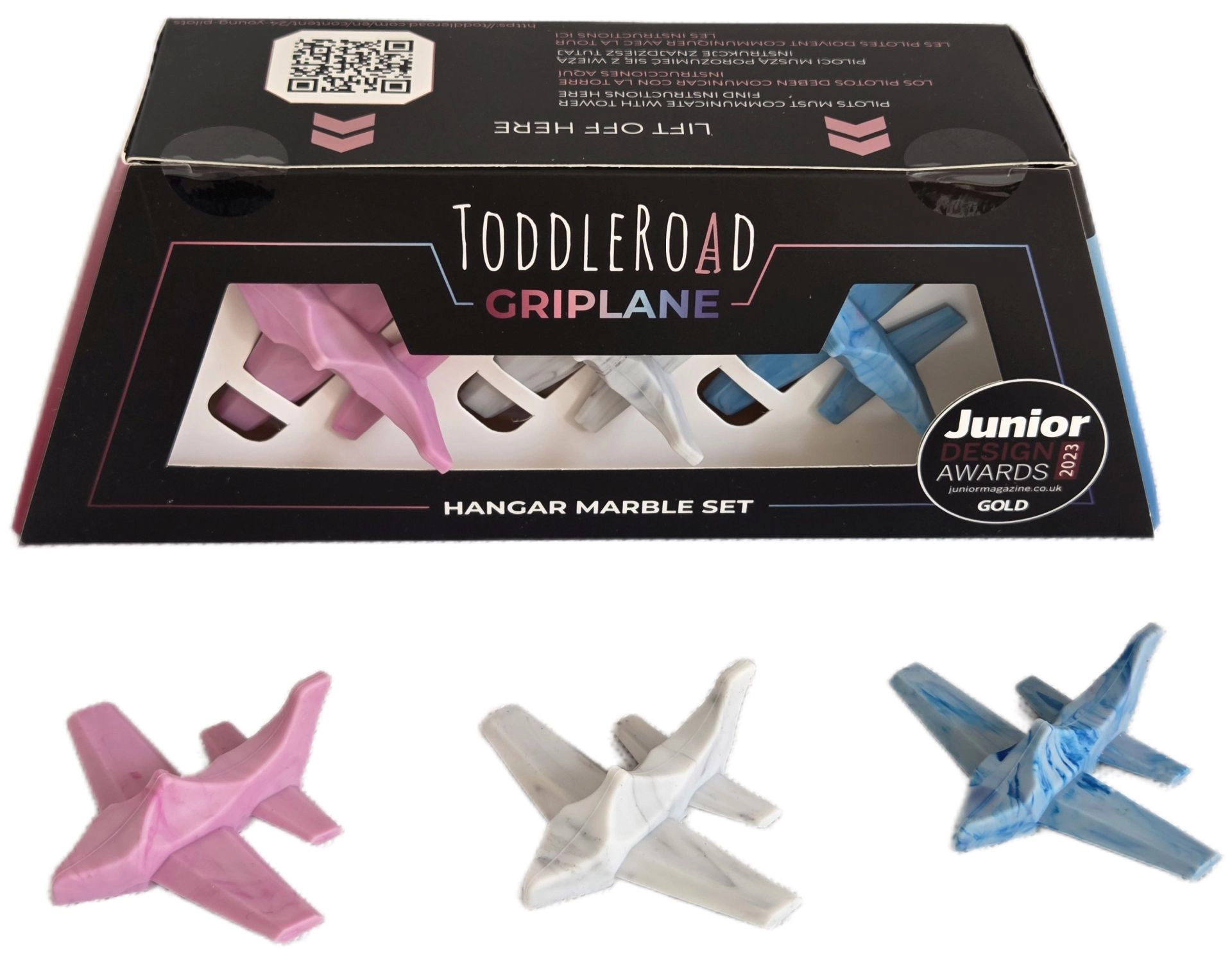 Rozšírte svoje letisko o sadu Toddleroad Hangár Marble s 3 ergonomickými silikónovými lietadlami v pastelových odtieňoch s mramorovým žilkovaním a s funkčnou krabicou hangára s potlačou. Hračka je bezpečná od 1 roka, podporuje jemnú motoriku, koordináciu ruka–oko a predstavivosť. Diely sú z potravinárskeho silikónu a možno ich umývať v umývačke do 50 °C.