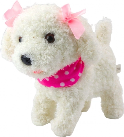 Roztomilý biely pudel na vôdzke je ideálny spoločník pre deti, ktoré si želajú vlastného miláčika. Je z mäkkého plyšu a vie chodiť, štekať a reagovať na pohladenie, takže hra je realistická a plná radosti.