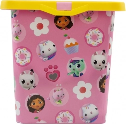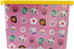 Ružový box so žltým vekom a hravými motívmi poteší deti a podporí ich chuť udržiavať poriadok.