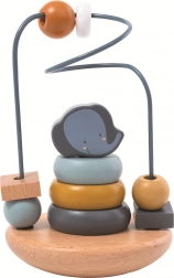 Korálkový labyrint so slonom trénuje ruka–oko a úchop, dúhové oblúky zas pomáhajú zoraďovať podľa veľkosti a stavať kreatívne tvary.