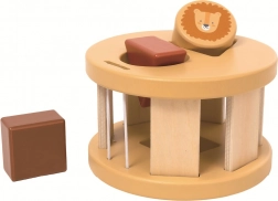 Odolný tvarovací bubienok s rotujúcim vekom a motívom leva učí deti rozpoznávať a párovať tvary, podporuje koordináciu a presnosť úchopu.