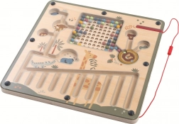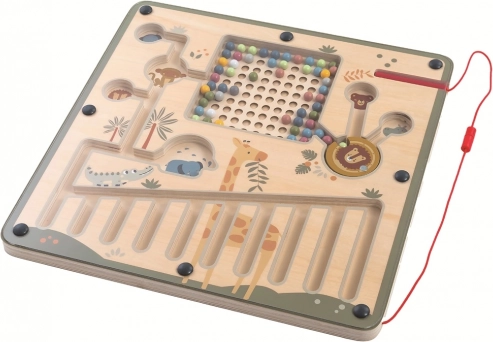 Táto drevená magnetická hracia doska s roztomilými zvieratkami je ideálna na domáce hranie, do škôlok aj herných kútikov. Farebné guličky vedú deti vyfrézovanými cestičkami pomocou šnúrkou pripojeného magnetického pera – skladajú jednoduché obrázky podľa 5 predlôh, priraďujú guličky k správnym zvieratkám a triedia ich do zásobníkov od najmenšieho po najväčší.