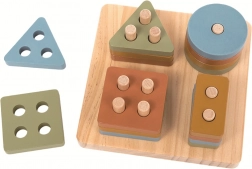 Táto kvalitná drevená nasadzovacia hra ponúka štyri základné tvary – štvorec, trojuholník, kruh a obdĺžnik – v príjemných farbách. Každý tvar má odlišný počet otvorov, čo deťom pomáha pochopiť princíp triedenia a logického uvažovania. Pri nasadzovaní dielikov na kolíky si deti prirodzene trénujú úchop, presnosť pohybu a sústredenie.