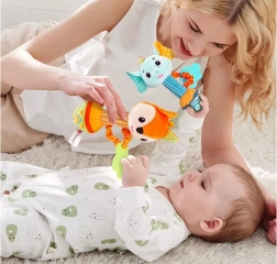 Táto multisenzorická hračka prináša bábätku istotu aj zábavu: vo vnútri je ukrytá hrkálka s príjemným zvukom, ušká zo šušťavej látky lákajú k objavovaniu a po stlačení bruška sa ozve veselý pískot. Kontrastné farby a rôzne textúry prirodzene rozvíjajú zrak, sluch aj hmat.