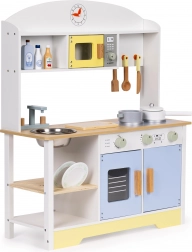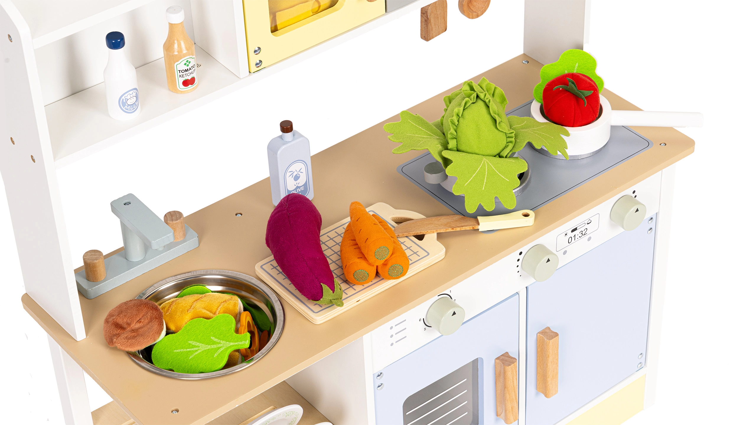 Vďaka práčke s otočným voličom, praktickým skrinkám a policiam a hodinám s pohyblivými ručičkami rozvíja kuchynka jemnú motoriku, vnímanie času aj zodpovednosť. Súčasťou je 12 drevených doplnkov – hrniec, panvica s pokrievkou, tanieriky, príbory, doska na krájanie a fľaštičky „olivový olej“, „kečup“ a „mlieko“ – pre okamžité hranie.