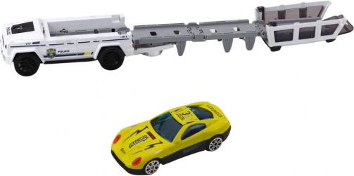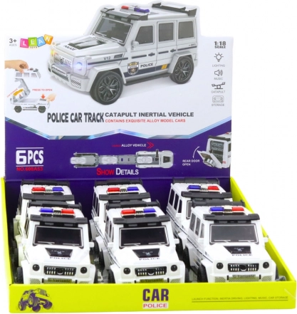 Zábavné policajné terénne auto v bielej farbe prináša deťom akciu a fantáziu. Vďaka treciemu pohonu vyrazí vpred po jednoduchom postrčení, o realistickú atmosféru sa starajú svetelné a zvukové efekty. Po otvorení sa vozidlo premení na dráhu s katapultom, z ktorej možno vystreliť malé autíčko – dvojitá porcia zábavy v jednom.