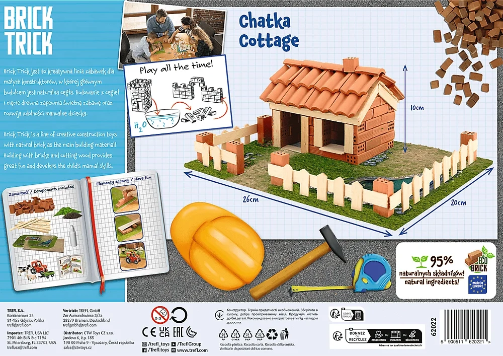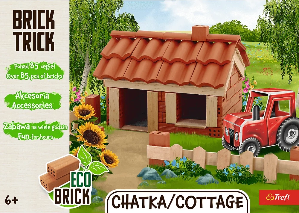 Objavte stavebnicu Trefl Brick Trick Eco Chata, ktorá umožní deťom stavať krok za krokom od základov až po hotový model so strechou, plotom a dvorom. Reálne mini tehličky, drevo a dekoratívne doplnky tvoria autentický vzhľad malého vidieckeho domčeka. Hotovú stavbu oživíte papierovými figúrkami a tematickými doplnkami.