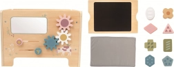 Pod sedákom sa skrýva praktická kresliaca tabuľka na prvé obrázky a poznámky. Po stranách deti zabaví pestrá škála herných prvkov: labyrint so zvieratkami na tréning trpezlivosti, vkladacie tvary na spoznávanie tvarov, ozubené kolieska na pochopenie príčiny a následku, hodiny na učenie času a zrkadielko na hravú sebareflexiu.