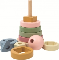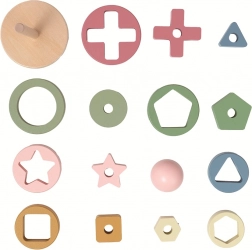 Deti postupne nasadzujú na drevenú tyčku krúžky rôznych veľkostí, z ktorých každý má uprostred výrez – hviezdičku, štvorec, trojuholník a ďalšie tvary. Keď sú všetky diely správne na svojom mieste, nasadí sa guľatá hlavička a panáčik je kompletný. Hra prirodzene podporuje koncentráciu, trpezlivosť a radosť z objavovania.