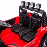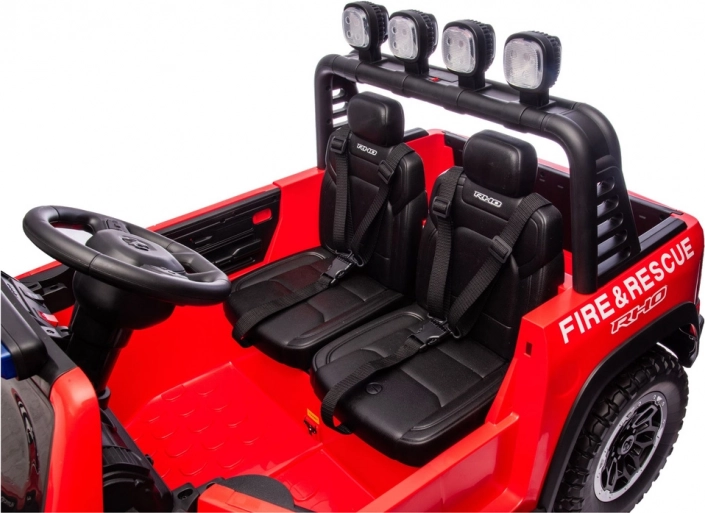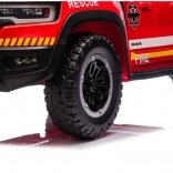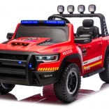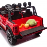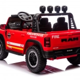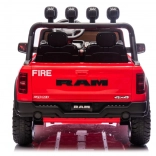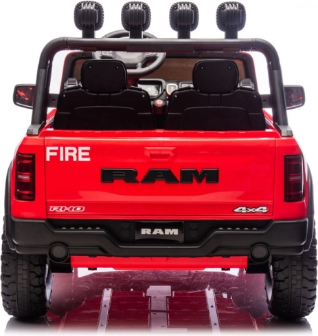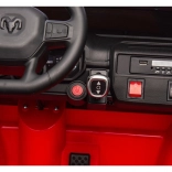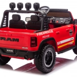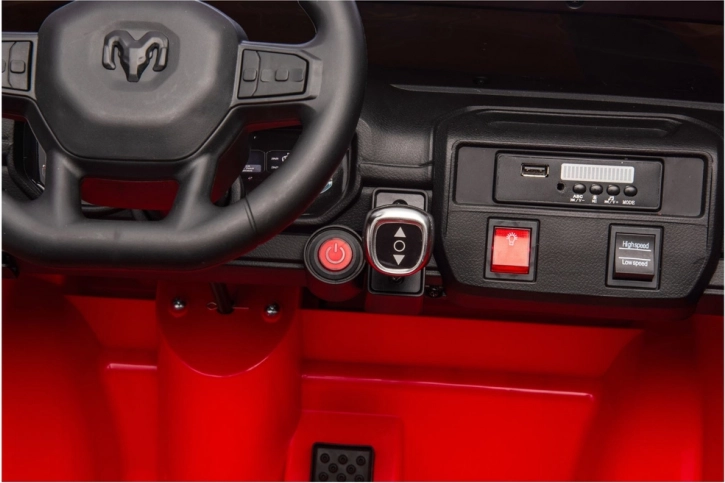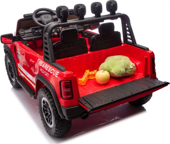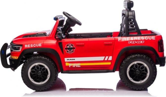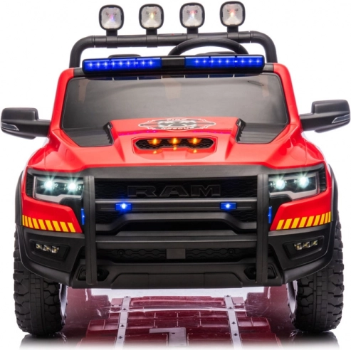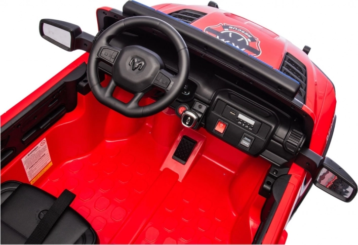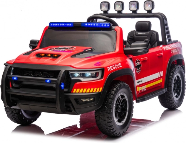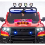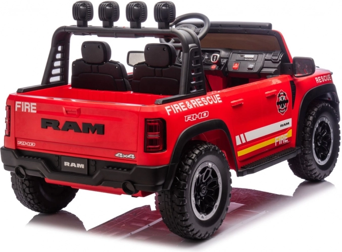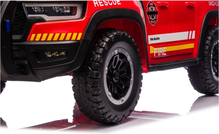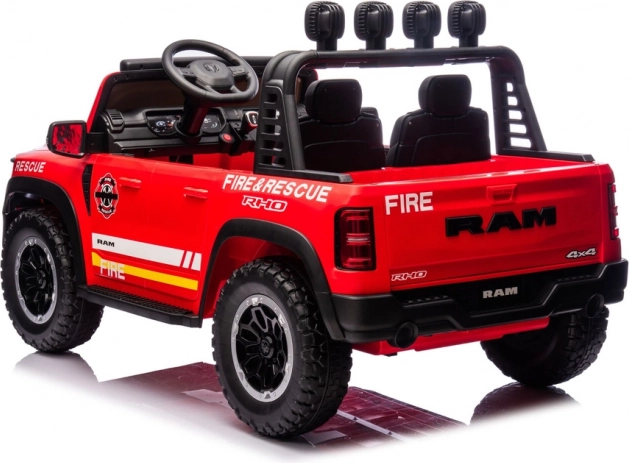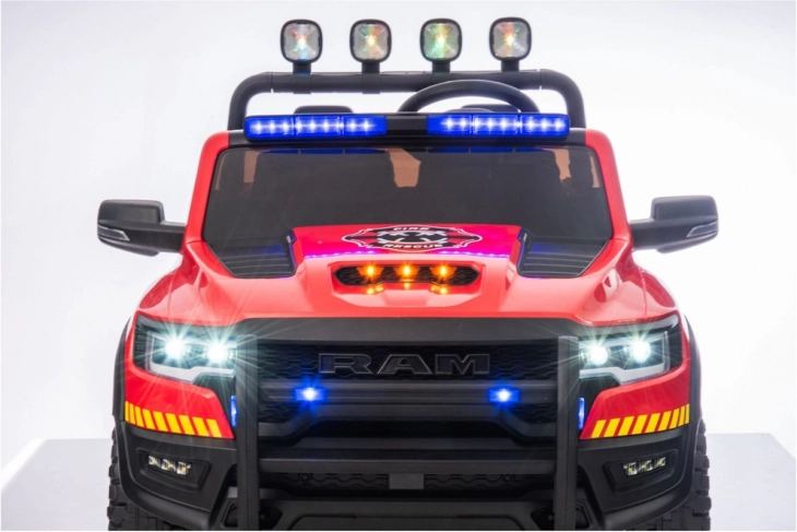Štýlový červený pick‑up v štýle RAM je ideálny pre malých nadšencov do hasičov. Dvojmiestne prevedenie s bezpečnostnými pásmi, realistický kokpit s volantom, pedálom a mediálnym panelom aj výrazné LED lišty na streche premenia každú vychádzku na napínavú záchrannú akciu. Veľké profilované kolesá a ochranný predný rám zabezpečujú stabilnú jazdu a odolný vzhľad.