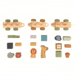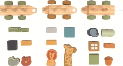 Tento drevený vláčik s lokomotívou a dvomi vagónikmi prináša deťom veľa zábavy aj učenia. Na tyče na podvozkoch deti nasadzujú farebné dieliky a stavajú si vlastný vláčik, zatiaľ čo roztomilé zvieratká – žirafa, slon, medveď, lev, hroch a krokodíl – idú na výlet. Hračka podporuje rozvoj motorických zručností, trpezlivosti a koncentrácie.