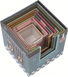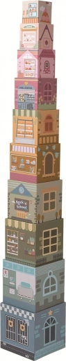 Táto pôvabná drevená stavebnica v jemných pastelových farbách premení každú hru na dobrodružstvo. Každá z 10 kociek predstavuje tematickú mestskú budovu – školu, nemocnicu, kníhkupectvo, kvetinárstvo, supermarket a ďalšie. Deti môžu vytvárať vysoké veže aj rozmanité ulice a zároveň trénovať koordináciu oko–ruka a priestorové vnímanie.