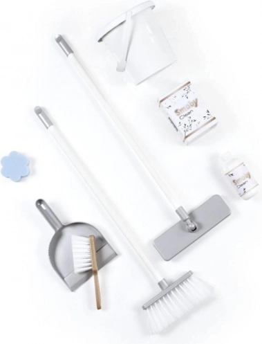 Súčasťou je lopatka a metlička, mop, kefka, vedierko a makety čistiacich prostriedkov – všetko na hranie rolí a rozvoj jemnej motoriky.