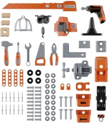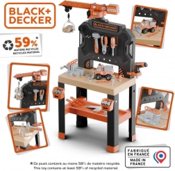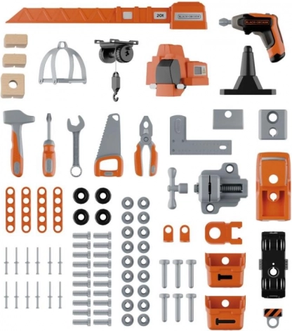 Súčasťou je stavebnica auta, ktorú malí mechanici jednoducho zostavia v niekoľkých krokoch. Dielňa obsahuje kladivko, kľúč na kolesá, skrutkovač, plochý/vidlicový kľúč, kliešte, pílu, veľkú svorku a posuvné pravítko, ďalej skrutky, matice, klince a spojovací materiál. Kompatibilná a rozšíriteľná so všetkými nástrojmi BLACK+DECKER od značky Smoby.